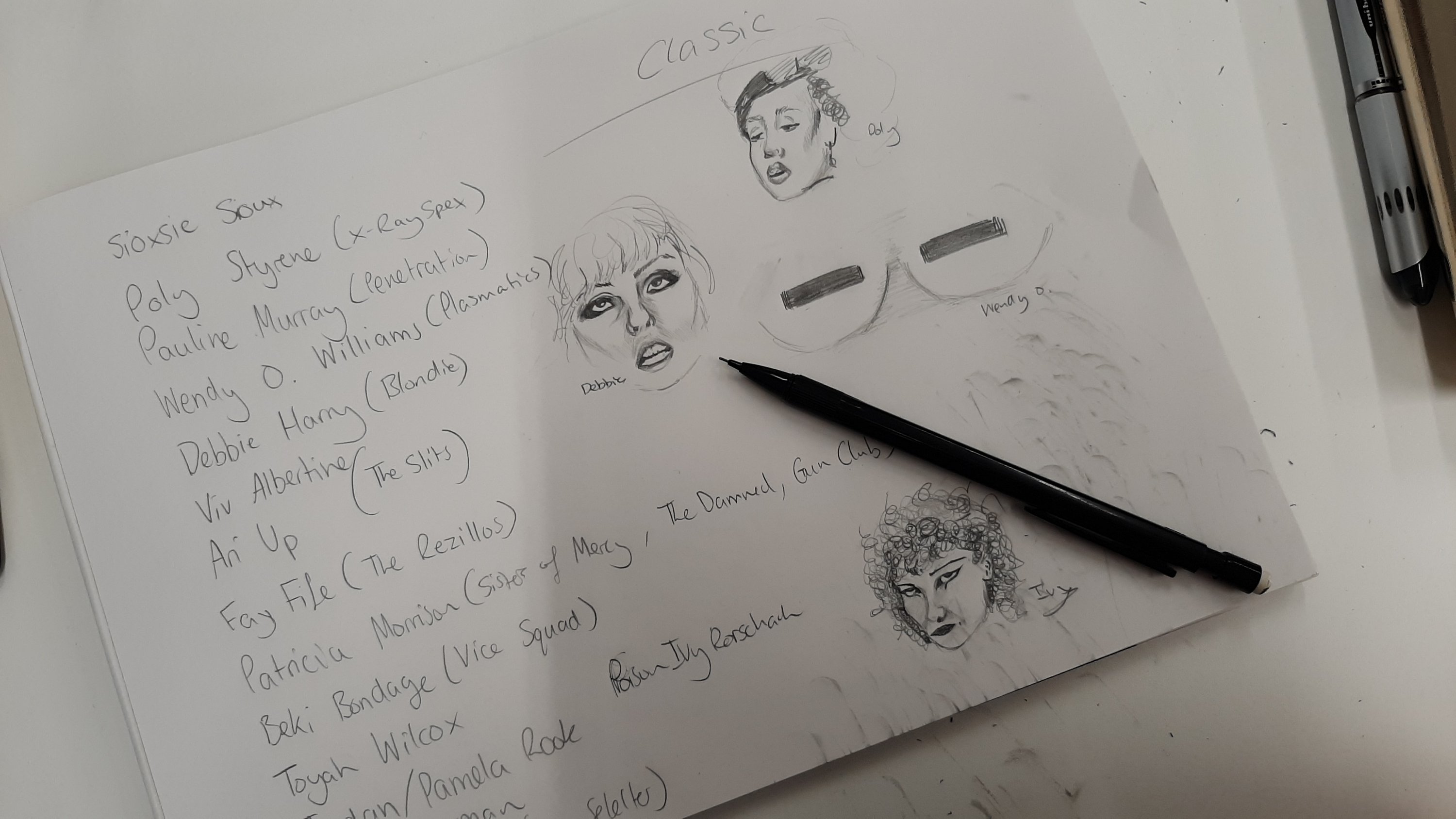 Really quickly from my memory I wrote down 15 female musicians I could think of that have been an important part of the music scene. I then sketched alongside this list to help identify differences and similarities between the favourite females of mine.