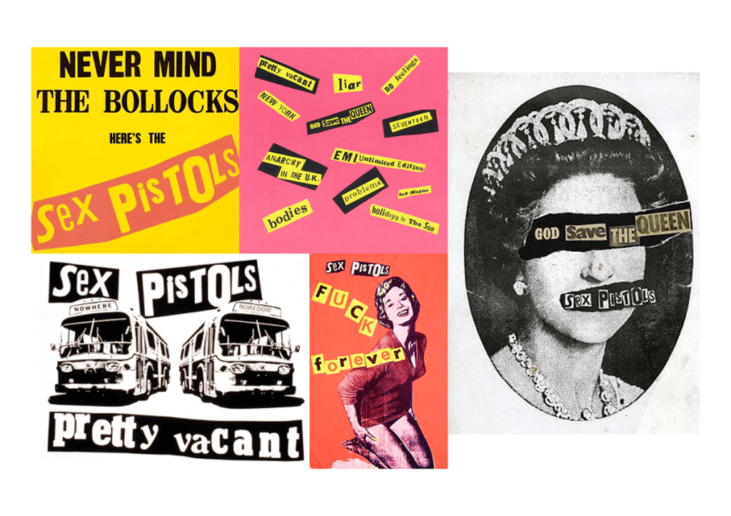 Sex Pistols visual identity created by Jamie Reid. A very typical visual style associated with the punk movement.